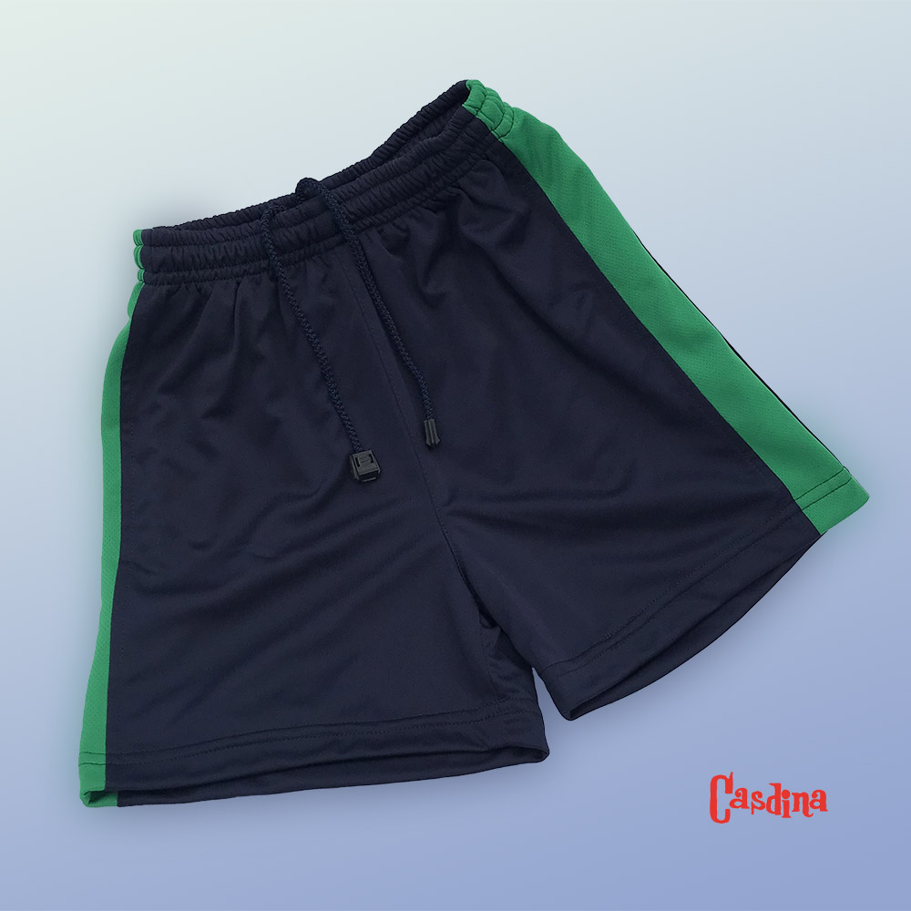 Short marino 100% Poliéster, con franjas laterales verdes, resorte en cintura con jareta ajustable.